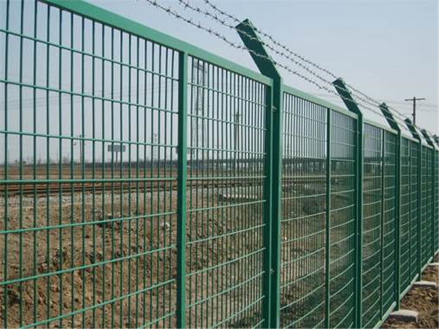 鐵路線路上采購防護柵欄是要保證安全,所以對防護柵欄要求較高。鐵路線路上使用的柵欄類型也不太一樣,根據使用的位置,鐵路防護柵欄的強度也都有區別。鐵路防護柵欄的類型大致分為:雙邊絲護欄,直框護欄,頂部30°折彎的護欄。一般鐵路線路兩側為了阻止落石或者阻擋外界的任何動物的時候會選擇雙邊絲護欄網作為隔離網。鐵路鐵軌兩側會使用直框護欄或者加折彎的護欄作為防護網。但是作為鐵路防護柵欄的護欄邊框不能使用普通的20*30的小邊框,而是采購30*40的方管邊框作為護欄網的邊框與低碳鋼絲焊接。或者是以鋼板網作為網片,四周焊接角鐵,也被稱為框架型的鐵路防護柵欄。安裝尺寸:1.8米*3米,柱中到柱中,鐵路線路上常采用水泥立柱與網片連接。邊框:30*40mm,或者40*40的角鐵。表面處理:浸塑草綠色或者浸塑墨綠色。
