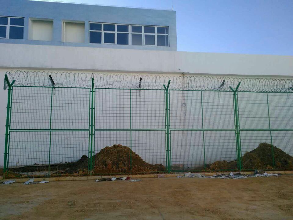監獄鋼網墻護欄網與普通護欄網最大的不同在于監獄護欄網頂部的V型支架,這些V型支架與支柱焊連在一起,堅固又牢靠,你不必擔心它在堅固性方面的問題,而且這種形狀給人一種大氣的感覺,美觀程度頓時提升了不少。V型支架的上部纏繞有普通刺繩,讓人無法爬越過去,V型加強筋讓網片更加更加牢固,能抵抗更強大的沖擊力。
