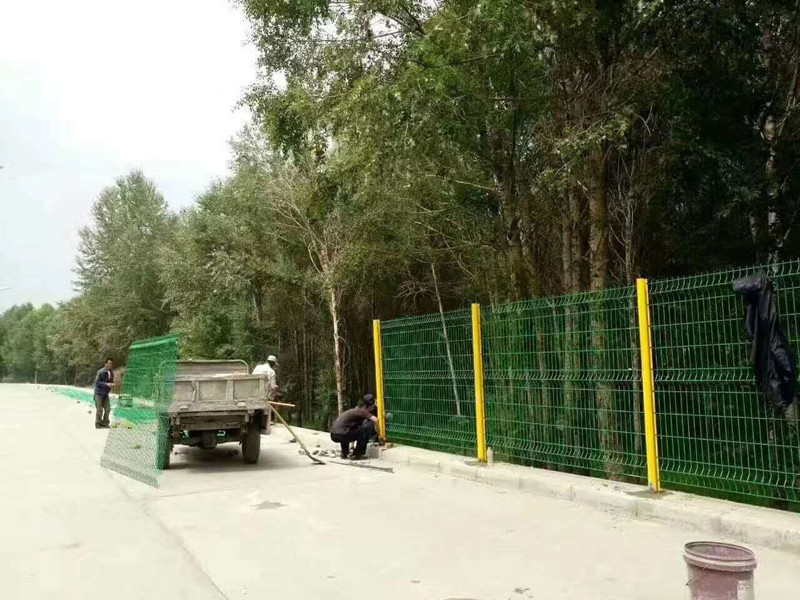先固定好第一根立柱,然后把網片掛接到立柱上。緊接著掛接第二根立柱,接好后把第二根立柱固定好,然后掛接第二張網片,再掛接好第三根立柱。以此類推,一套一套的安裝,直到最后就可以了。這樣安裝的話既牢固又不會損壞網面。為防止立柱歪斜可以用固定物支撐住立柱,此時可以再次測量柱子到柱子的位置,如果不對可以微調一下柱子。如果是為了使護欄更牢固,可以在坑中填制混凝土。