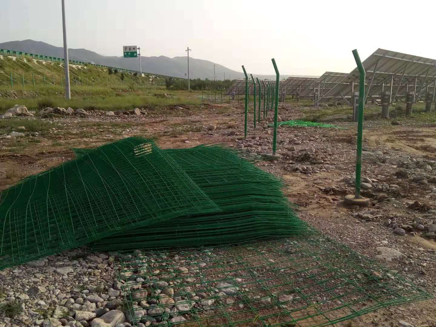 蔚縣楚總在我廠訂購1580套光伏電站防護網,于今日安裝進行中,關于蔚縣楚總采購的護欄網規格如下,型號為雙邊絲護欄網,尺寸2000x3000mm,網孔75x150mm,絲粗4.5mm,立柱48圓管x2.5厚,2.4米高,材質為Q195熱鍍鋅絲,立柱材質為Q235低碳鋼鍍鋅管.