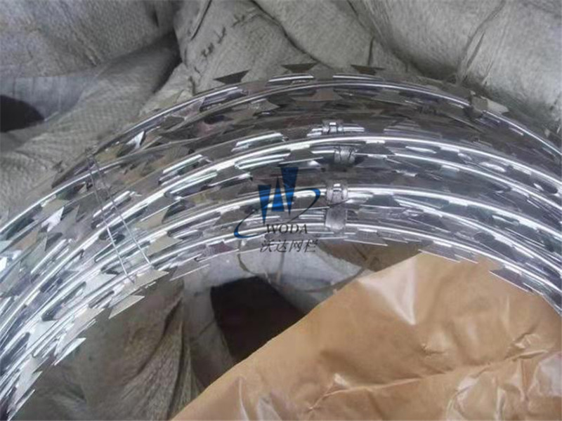 工藝:刀片刺繩由熱鍍鋅鋼板或不銹鋼薄板沖壓出尖銳的刀片狀,高張力鍍鋅鋼絲或者不銹鋼絲做芯線組合而成的阻絕器材。